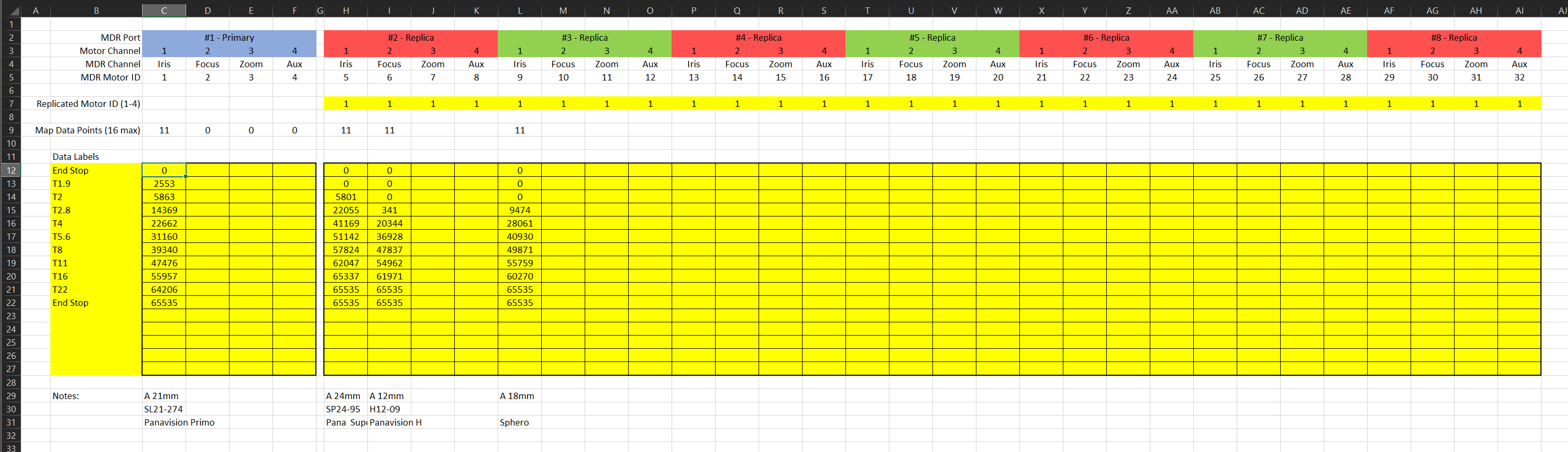 This row (Row 7, starting at Column H) lets you set which Primary motor (1-4) is mapped to the Replica motor (5-32). The Primary motor default is 1 and the Primary lens must be mapped. Replica lenses left blank will automatically map one-to-one with the Primary.